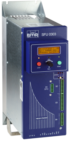 •The most versatile of the BMR frequency converter – the power solution for all kinds of spindles•Variable DC-link-voltage for optimum spindle voltage,thereby the best spindle control and running characterstics and lowest possible spindle temperature rise.•In most cases, sinusoidale filters or output chokes arenot necessary, also low-voltage spindles can be operatedwithout any problems•Galvanic isolation of the I/Os from the mains and spindleconnections•Integrated brake chopper resistor 200 W•Automatic spindle braking when mains power off duringoperation•Pulse blocking, optional as safe torque off •Available as control cabinet version (SSE) with optionaloperating panel, also as desk-top unit or 19"-version